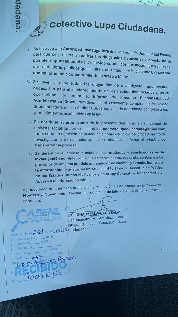 La denuncia fue interpuesta ante la Fiscalía Anticorrupción de Nuevo León por el activista Nacho Alvarado. Los señalamientos apuntan directamente a un esquema de malversación de fondos y daño patrimonial, en el que se habrían firmado contratos por cifras millonarias sin los debidos controles de legalidad y transparencia.